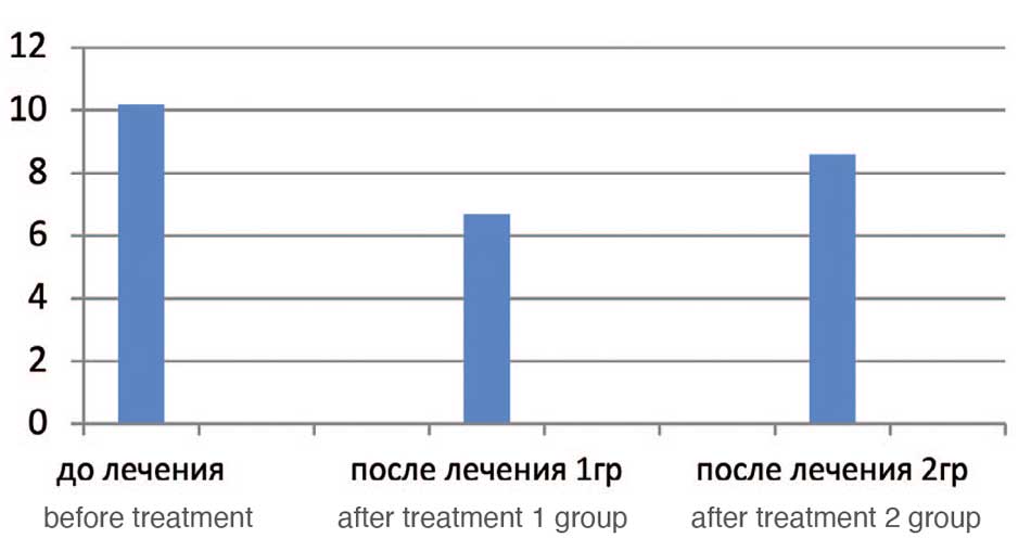 Также уменьшение интенсивности болевого синдрома по Международной шкале NIH-CPSS после лечения более выражено наблюдалось у больных 1 группы, составив 6,71±0,94 баллов (р<0,05), тогда как у пациентов 2 группы средний показатель болевого синдрома снизился до 8,6±1,2 балла (рис. 3).