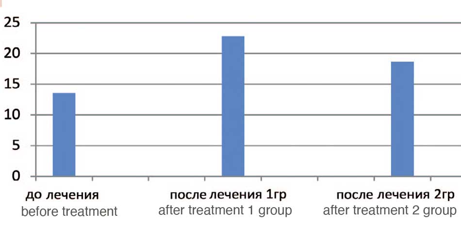 По данным ТРУЗИ, из всех исследуемых 68 мужчин, нормальная эхогенность ПЖ до лечения была выявлена у 10 пациентов, которых поровну распределили по группам. Нормализация эхоструктуры ПЖ после лечения достоверно была диагностирована у 28 (82,35%) больных 1 группы; у пациентов 2 группы нормализация наблюдалась у 19 (55,88%) пациентов. Результаты допплерографического исследования сосудов ПЖ после лечения свидетельствуют о более значимом улучшении показателей гемодинамики у больных 1 группы, в то время как во 2 группе существенного изменения гемодинамики не отмечалось. Плотность сосудистого русла в 1 группе возросла почти в 2 раза, пиковая систолическая скорость кровотока в артериях увеличилась в 1,6 раза (с 8,26±0,31 см/с до 13,38±0,56 см/с, р<0,01), также выросла и линейная скорость кровотока в венах в 1,3 раза (с 3,84±0,16 см/с до 4,92±0,21 см/с, р<0,01), в 3 раза возрос объемный кровоток (с 0,014±0,002 л/мин до 0,042±0,004 л/мин, р<0,001) (табл. 1).