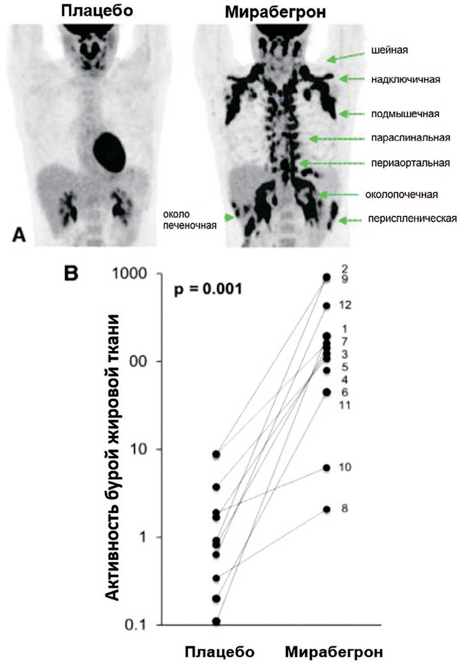 Исследование научной группы A.M. Cypess впервые продемонстрировало изменение активности БЖТ при воздействии агониста β3-АР у человека. В группе из 12 здоровых мужчин было изучено влияние препарата мирабегрон в отношении стимуляции БЖТ, по сравнению с плацебо. Показано, что мирабегрон способствовал более высокой метаболической активности, которая была измерена при позитронноэмиссионной томографии (ПЭТ-КТ). В качестве радиофармпрепарата использовали 18-фтордезоксиглюкозу (18F-FDG). У всех участников исследования, получавших мирабегрон, метаболическая активность БЖТ была достоверно (p=0,001) выше, чем в группе плацебо (рис. 2). Повышение скорости метаболизма в состоянии покоя (resting metabolic rate – RMR) составило 203±40 ккал/день (+13%; p=0,001). Метаболическая активность БЖТ также была значимым предиктором изменения RMR (p=0,006). Таким образом, была подтверждена идея о возможности использования агониста β3-AР для лечения метаболических заболеваний именно за счет стимуляции (термогенезиса) БЖТ [15].
