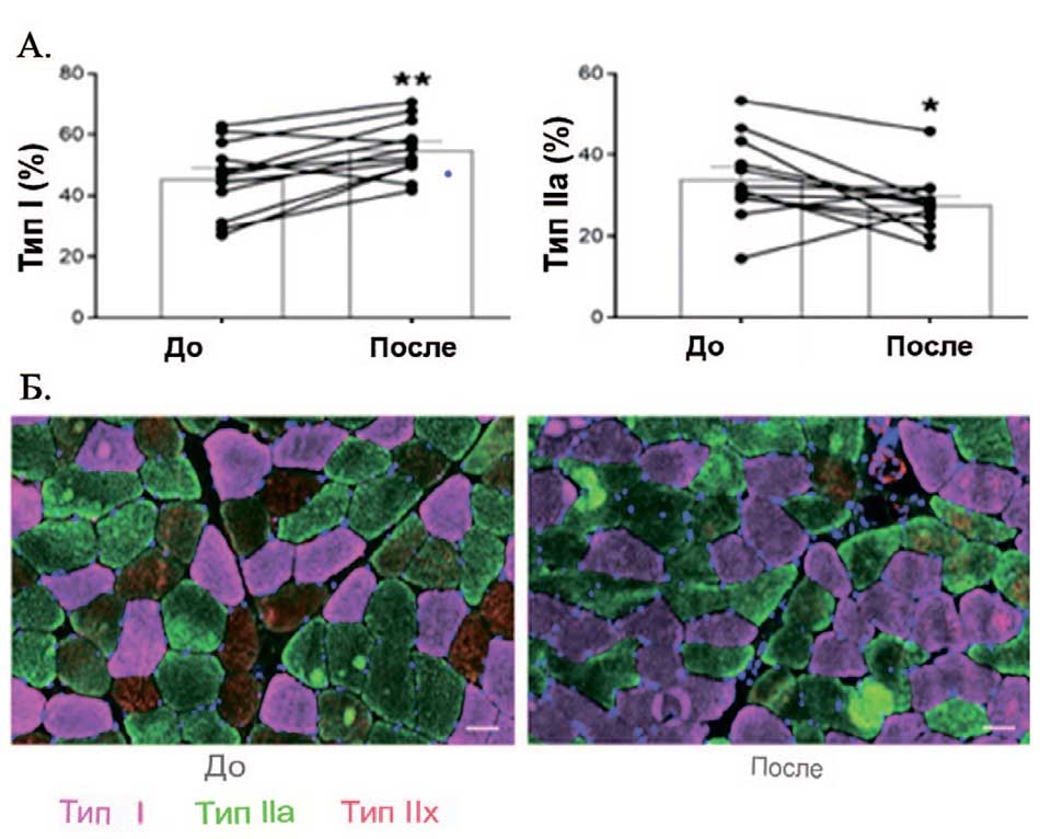 Рис. 4. Увеличение процентного содержания мышечных волокон типа I при приеме мирабегрона. А. Графическое отображение. Б. При электронной микроскопии. Репрезентативные изображения мышц, окрашенных на MyHC I, MyHC IIa и MyHC IIx, до и после лечения мирабегроном [28]