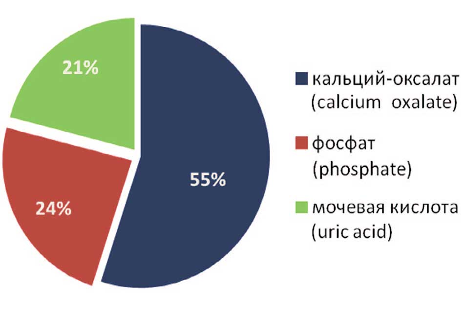 В 42 (20,2%) случаях удалось провести инфракрасную спектрометрию извлеченных конкрементов. Камни с однородным и близким к однородному составом (не менее 90%) встречались относительно редко – в 9 (21,4%) наблюдениях. Частота встречаемости камней с преобладанием кальций-оксалата составила 54,8% (23 случая), фосфатов – 23,8% (10), мочевой кислоты – 21,4% (9), что соответствует современным эпидемиологическим данным (рис. 2).
