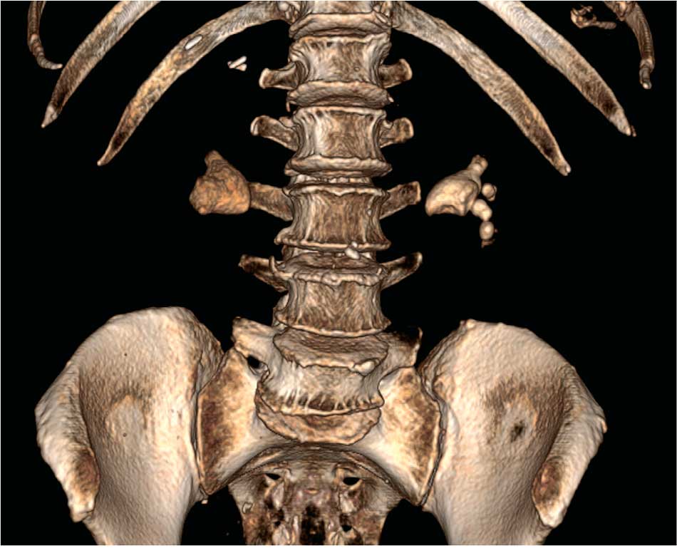 Рис. 6. Пациентка И. КТ почек от 04.08.2021,3D-модель, фронтальная проекция: до операции
