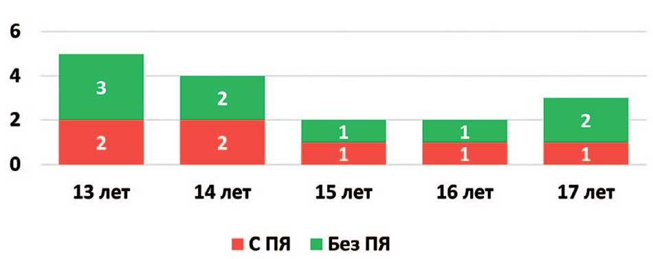 Рис. 3. Распределение подростков по возрасту и наличию ПЯ