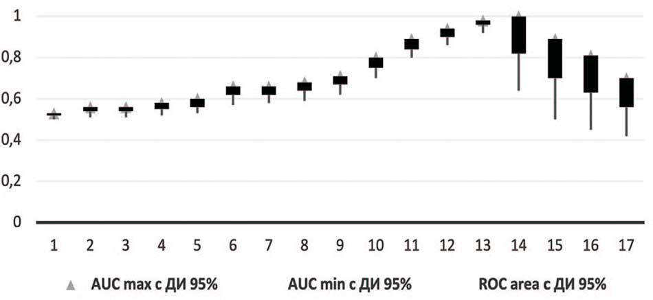 Рис. 4. Значения площади под ROC-кривой (AUC) для дискретных значений возраста от 1 до 17, рассматриваемых в качестве точек отсечения для определения наличия ПЯ